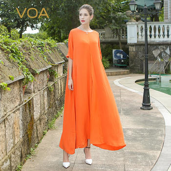 VOA Heavy Silk Pregnant Woman Orange Maxi Dress Loose Casual Comfort Solid Long Robe Plus Size Half Sleeve O-Neck Leisure A7070