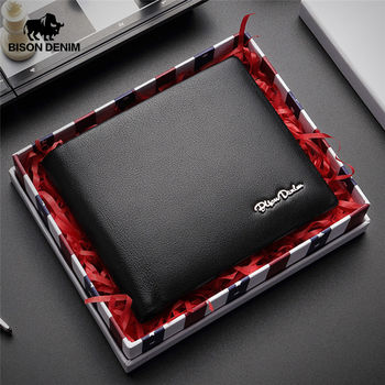 BISON DENIM Genuine Leather RFID Wallet Male Multifunctional Card Holder Wallet with Coin Purse Soft Standard Money Bag W4495