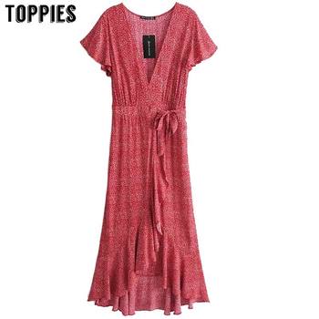 Floral Printing Summer Short Sleeve Vacation Long Dress Bohemian Sundress Lace Up Waist