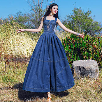 Free Shiping 2020 New Fashion Women Vintage Cotton Denim Long Maxi Strap Sleeveless Dresses Spring And Autumn Gorgeous Dress S-L
