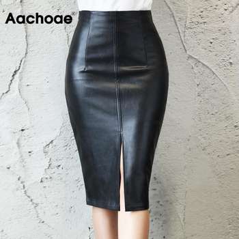 Aachoae Black PU Leather Skirt Women 2020 New Midi Sexy High Waist Bodycon Split Skirt Office Pencil Skirt Knee Length Plus Size
