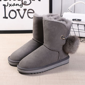 JXANG 2020 High Quality Crystal Pom-pom Brooch Women Winter Shoes Fox Fur Ball Sheepskin Suede Leather Lined Women Snow Boots