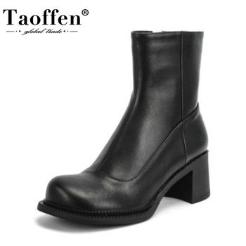TAOFFEN Genuine Leather Women Short Boots Fashion Zipper Thick Heel Shoes Woman Winter Office Lady Party Footwear Size 34-39