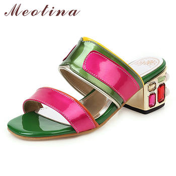 Meotina Summer Slippers Women Shoes Mixed Colors Thick High Heels Shoes Rhinestone Open Toe Slides Ladies Sandals Big Size 33-46