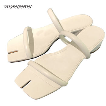 2020 New Split Toe Sandals Fashion Thin Flat Women’s Hot Square Toe Flip Flops Black White Real Leather Cool Open Toe Slides
