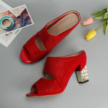Meotina Sexy Women Shoes Summer Peep Toe Slides Party Evening Chunky High Heels Slipper Crystal Silver Sandals Ladies Slides Red