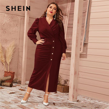 SHEIN Plus Size Burgundy Button Front Shawl Collar Lantern Sleeve Dress Women Spring Plus High Waist Elegant Fitted Maxi Dresses