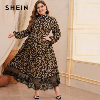 SHEIN Plus Size Zipper Back Lantern Sleeve Lace Hem Leopard Print Dress Women High Waist Fit and Flare Glamorous Maxi Dresses