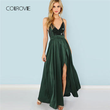 COLROVIE Green Sequin Split V-Neck Dress High Waist Backless Maxi Dress Sexy Satin