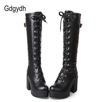 Gdgydh Hot Sale Spring Autumn Lacing Knee High Boots Women Fashion White Square Heel Woman Leather Shoes Winter PU Large Size 43