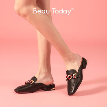 BeauToday Mules Women Genuine Cow Leather Metal Decoration Square Toe Slip On Outdoor Ladies Flat Shoes Handmade 35059