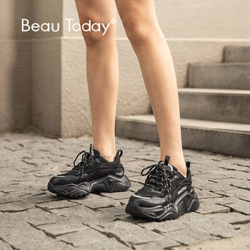 BeauToday Chunky Sneakers Women Cow Leather Black Dad Shoes Round Toe Lace-Up Lady Casual Platform Shoes Handmade 29534