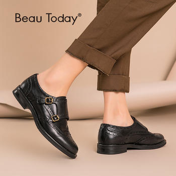 BeauToday Monk Shoes Women Buckle Straps Genuine Leather Calfkin Round Toe Lady Flats Handmade Brogue Style Shoes 21408