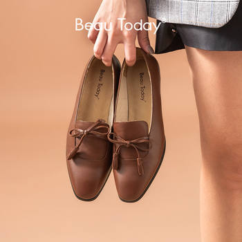 BeauToday Bowknot Loafers Women Genuine Cow Leather Square Toe Spring Autumn Slip-On Ladies Casual Flat Shoes Handmade 27179