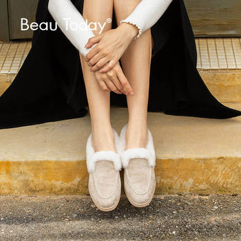 BeauToday Loafers Women Kid Suede Genuine Leather Round Toe Slip-On Lady Winter Warm Short Plush Shoes Handmade 27820