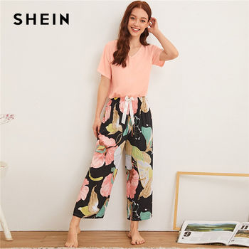 SHEIN Multicolor Floral Print Tie Front Pajama Set Women Summer Nightwear Short Sleeve V-neck Sleepwear PJ Pant Sets