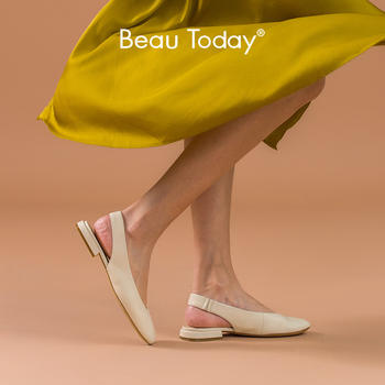 BeauToday Sandals Women Genuine Leather Sling Back Elastic Strap Flat Heel Square Toe Ladies Summer Shoes Handmade 30070
