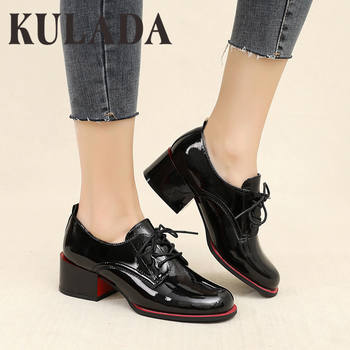 KULADA New Women Pumps Shoes Patent Leather Thick Heel Shoes Women Round Toe Pumps Fashion Ladies Lace-up Shoes Spring Autumn