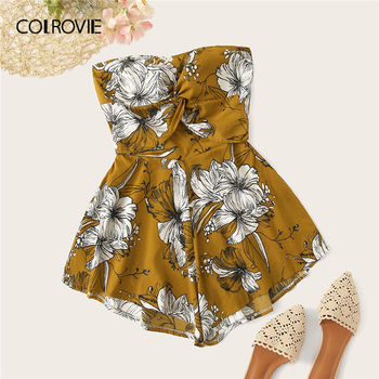 COLROVIE Ginger Floral Print Twist Tie Back Tube Boho Romper Women Playsuit Summer Holiday Strapless Girly Short Jumpsuit