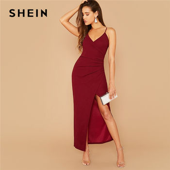 SHEIN Wrap Ruched Side Split Thigh Slip Dress Women Autumn Spaghetti Strap