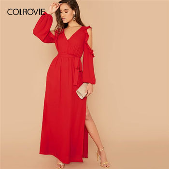 COLROVIE Red Cut Out Sleeve Ruffle Trim Split Thigh Dress Women V neck Belted Boho Autumn High Waist Dresses