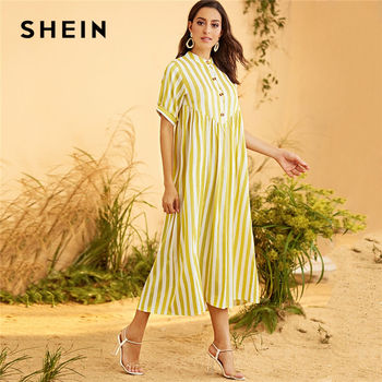 SHEIN Yellow Striped Button Up Half Placket Maxi Modest Dress Women Summer Autumn Short Sleeve High Waist Pleated Long Dresses