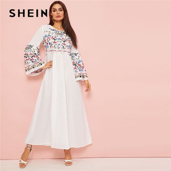 SHEIN Abaya Flower Embroidered Frilled Trim Bell Sleeve Dress Women Spring Autumn Maxi White Dress Loose A Line Elegant Dresses