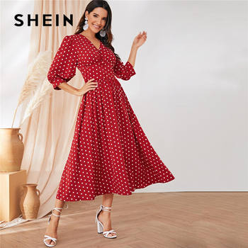 SHEIN Burgundy Polka Dot Wide Waistband Button Detail Maxi Dress Women Elegant V Neck Bishop Sleeve Long Dress Party Dresses