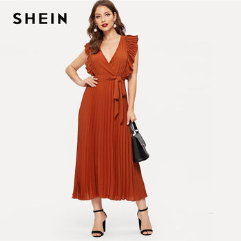 SHEIN Frilled Cuff Pleated Panel Fit And Flare Maxi Dress Women Spring Elegant Solid High Waist A Line Long Dress Party Dress