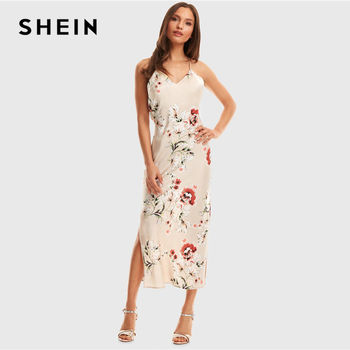 SHEIN Apricot Crisscross Draped Back Split Side Floral Maxi Dress Women Spaghetti Strap