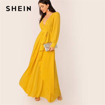 SHEIN Mustard Self Belted Wrap Maxi Dress Women Glamorous High Waist V Neck Party Dress Ladies Spring Bishop Sleeve Long Dresses