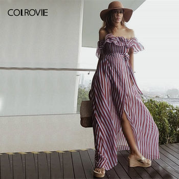 COLROVIE Striped Belted Layer Ruffle Off The Shoulder Boho Maxi Dress