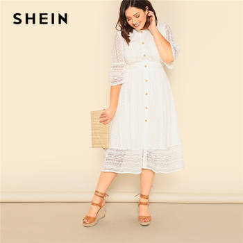 SHEIN Plus Size Lady Romantic Button Front Lace Overlay Maxi Dress Spring Elegant High Waist Half Sleeve A Line Long Dress