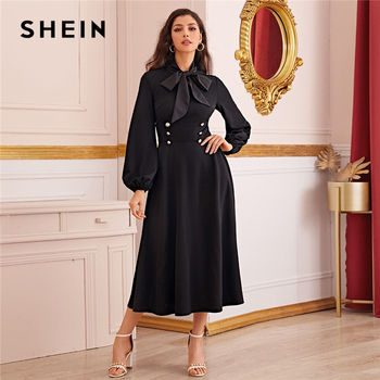 SHEIN Black Tie Neck Buttoned Waist Elegant Maxi Dress Women Autumn Bishop Sleeve High Waist Ladies Party Flared Long Dresses