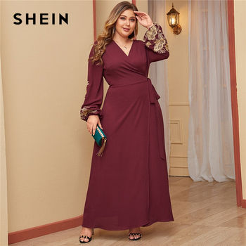 SHEIN Plus Size Burgundy Embroidered Floral Wrap Belted Maxi Dress Women Bishop Sleeve V-neck A Line Elegant Dresses