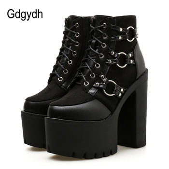 Gdgydh Spring Autumn Ankle Boots Women Platform Boots Rubber Sole Buckle Black Leather PU High Heels Shoes Woman Comfortable