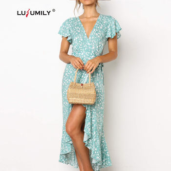 Lusumily Summer Long Dress Women Boho Floral Print Dresses Short Sleeve Sundress Summer Beach Ladies Streetwear Retro Maxi Dress