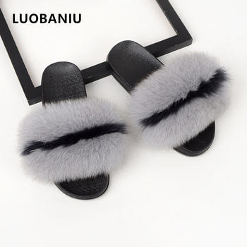 Women Fur Slippers Shoes Real Fox Slippers Fluffy Slippers Women Flat loafers Shoes Summer Sandals Ladies Shoes big size 36- 44