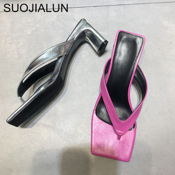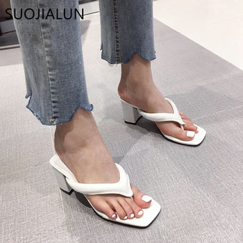 SUOJIALUN 2020 New Brand Women Summer Slippers Square High Heel Gladiator Beach Flip Flop Slides Slip On Women Outdoor Sandal