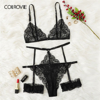 COLROVIE Black Scalloped Trim Floral Garter Women Lace Lingerie Set Sexy Femme Intimates Transparent Underwear Bra Set