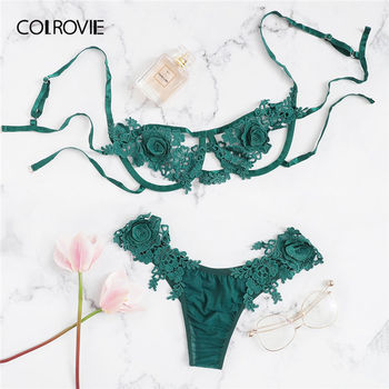 COLROVIE Green Floral Harness Appliques Lace Sexy Lingerie Set Women Intimates Black Underwire Underwear Ladies Bra Set