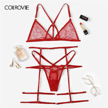 COLROVIE Red Harness Sheer Garter Lingerie Set Women Intimates Summer See Through Sexy Bra And Panties Underwear Set