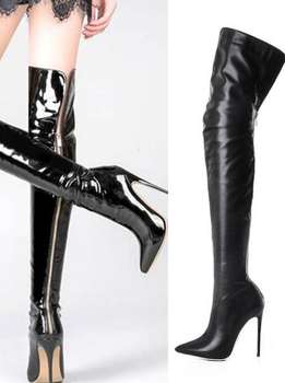 Woman Solid Black PateStiletto Heels Slim Over The Knee Thigh Long Elastic