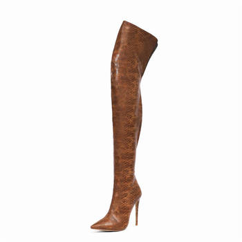 Over The Knee Snakeskin Boots Women Retro Bright Boots 12Cm Thin Heel High Boots Warm Fur Winter Shoes