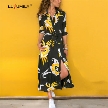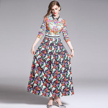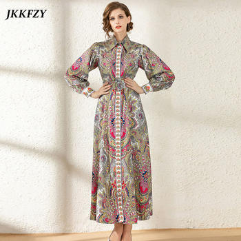 Design Runway Elegant Slim Print Fow Vintage Dress Women Long sleeve lapel Button Dress Women Plus Size Print Maxi Dress