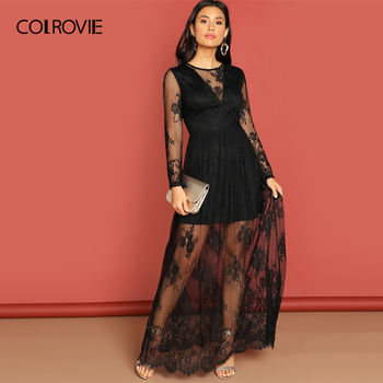 COLROVIE Black Mesh Long Sleeve Party Lace Dress Women Spring A Line High End Evening Ladies Dresses