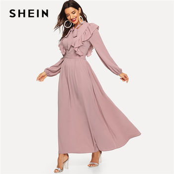 SHEIN Pink Abaya Tie Neck Fit and Flare Ruffle Pleated High Waist A Line Spring Solid Elegant Maxi Dresses