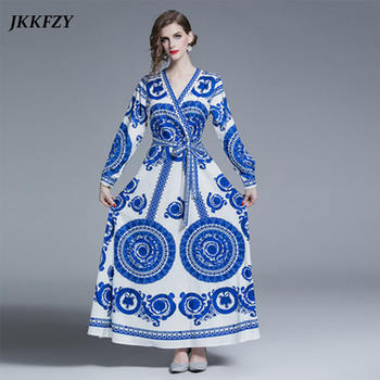Summer Women Long Sleeve V-Neck Runway Dress Belt Decoration Blue Print Maxi Dress Vestidos