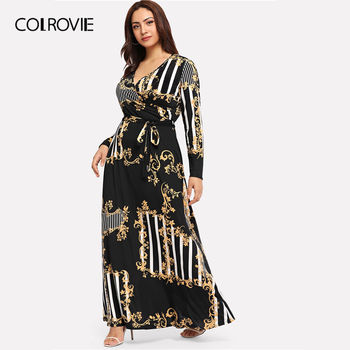 COLROVIE V Neck Scarf Print Belted Wrap Casual Spring Long Sleeve Party Maxi Dress Vacation Ladies Dresses