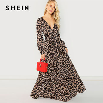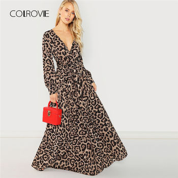 COLROVIE Knot Belted Deep V Neck Leopard Print Autumn Long Sleeve Elegant Maxi Dresses